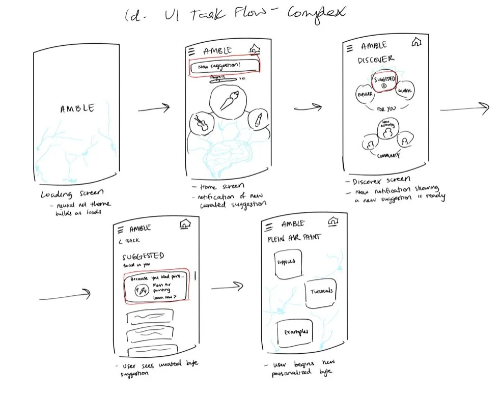 The third task allows the user to build on previous hobbies by receiving suggestions from the platform on what to explore next, with a screen that shows them new activities to discover and relevant information about how their app usage on amble led to the new suggestion. Incorporating this task was crucial to demonstrating how amble would keep users engaged in the app, especially in the case where their current activities are not interesting to them. In cases like these, or cases where the user finishes their current ‘bytes’, they can explore in new directions or dive deeper into the same activities, through sustained interaction.