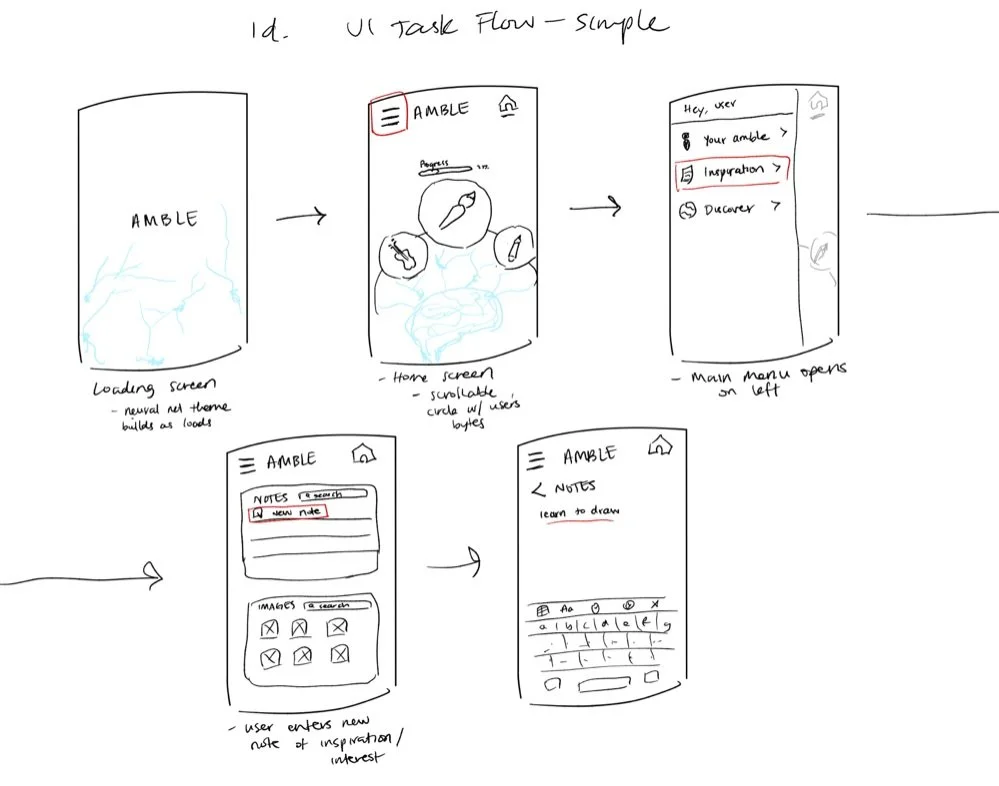 Scattered brainstorming, researching UI patterns, crafting a generic user flow, information architecture, and app screen sketches.