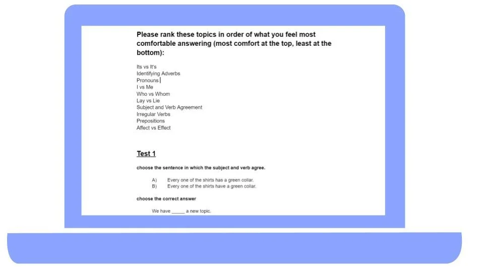 We asked the participant to rank grammar topics on a scale of least to most comfortable. Then we asked them to take 2 tests; on the first one they did not receive any help, on the second one they got notified before they answered a question that falls into one of their uncomfortable categories. They were provided a link and a minute to read important information. At the end we asked them to compare the two experiences and describe their overall level of confidence and direction.