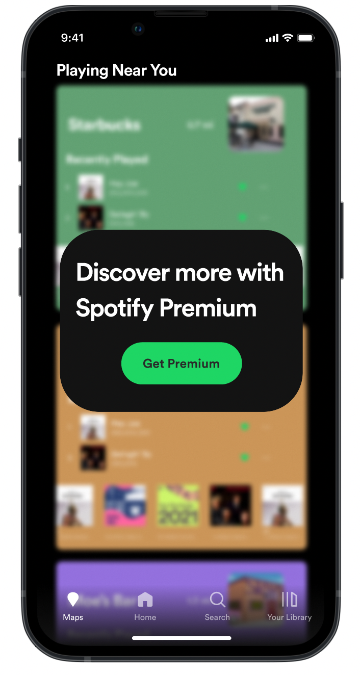 With the ‘Maps’ feature visible on the navigation bar on every screen and the blurred visibility on the ‘Maps’ main screen, users are enticed to learn more about this feature and further incentivized to join Spotify Premium.