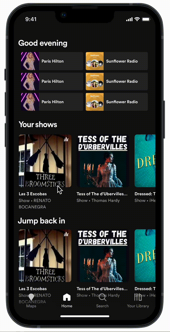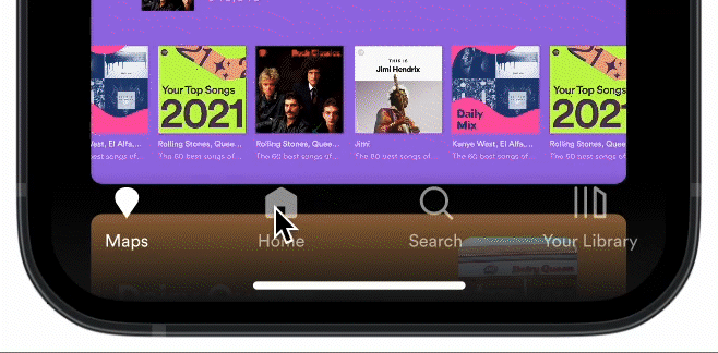 New bottom navigation bar that includes a panel for the ‘Maps’ feature; synthesized with the Spotify design system