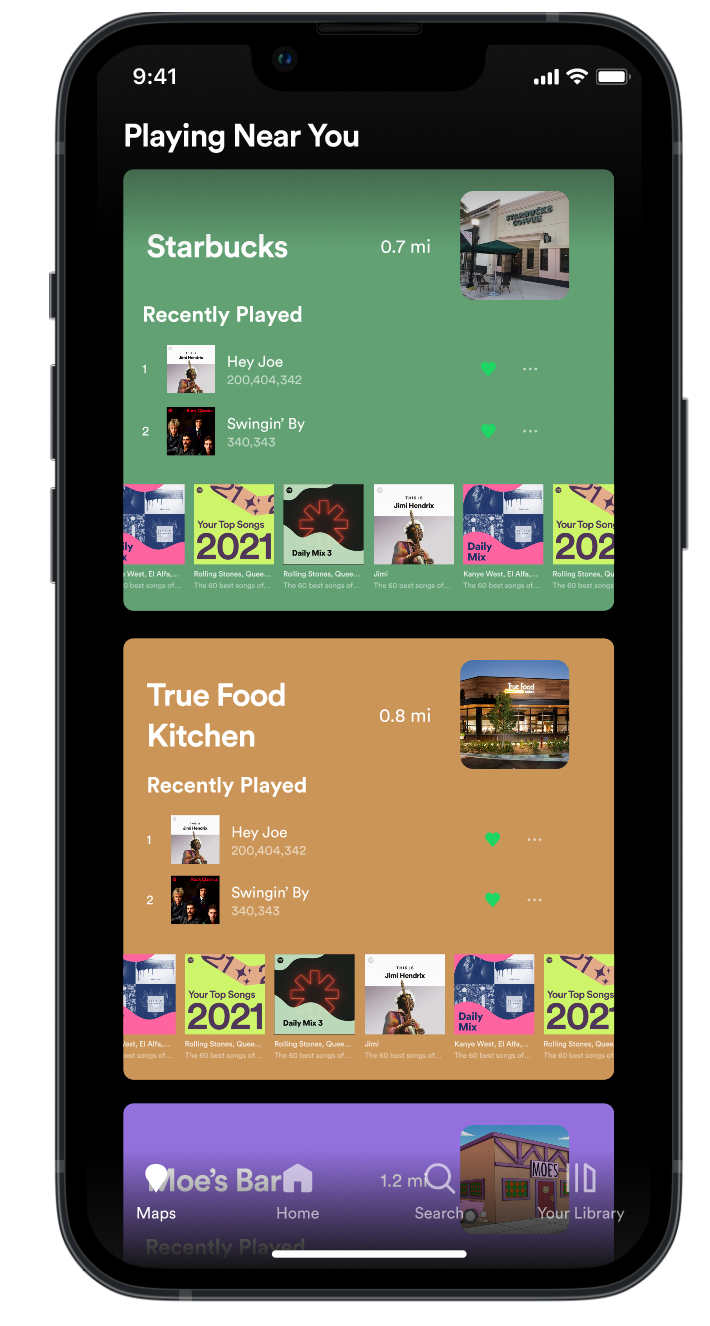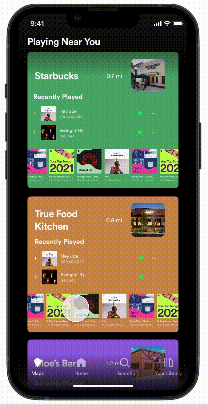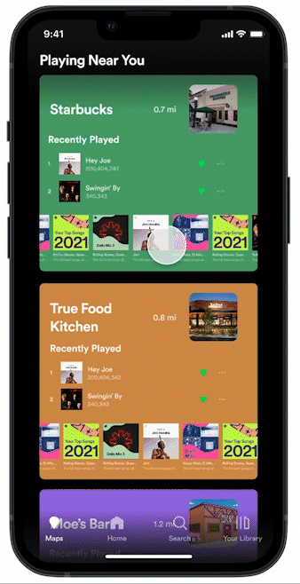 The new geography-based Spotify feature implemented below involved a new panel in the Spotify mobile application that allows users to scroll through the public profiles of locations near them.