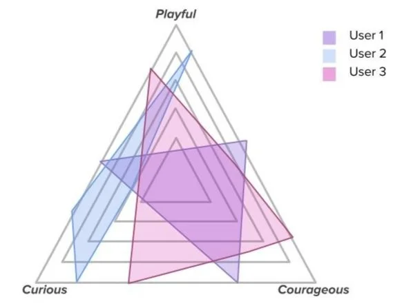 I used data visualizations to assess whether the qualitative data from the personalities of the users fulfilled this triangular model, representing the different combinations of desired traits that matched the brand story.